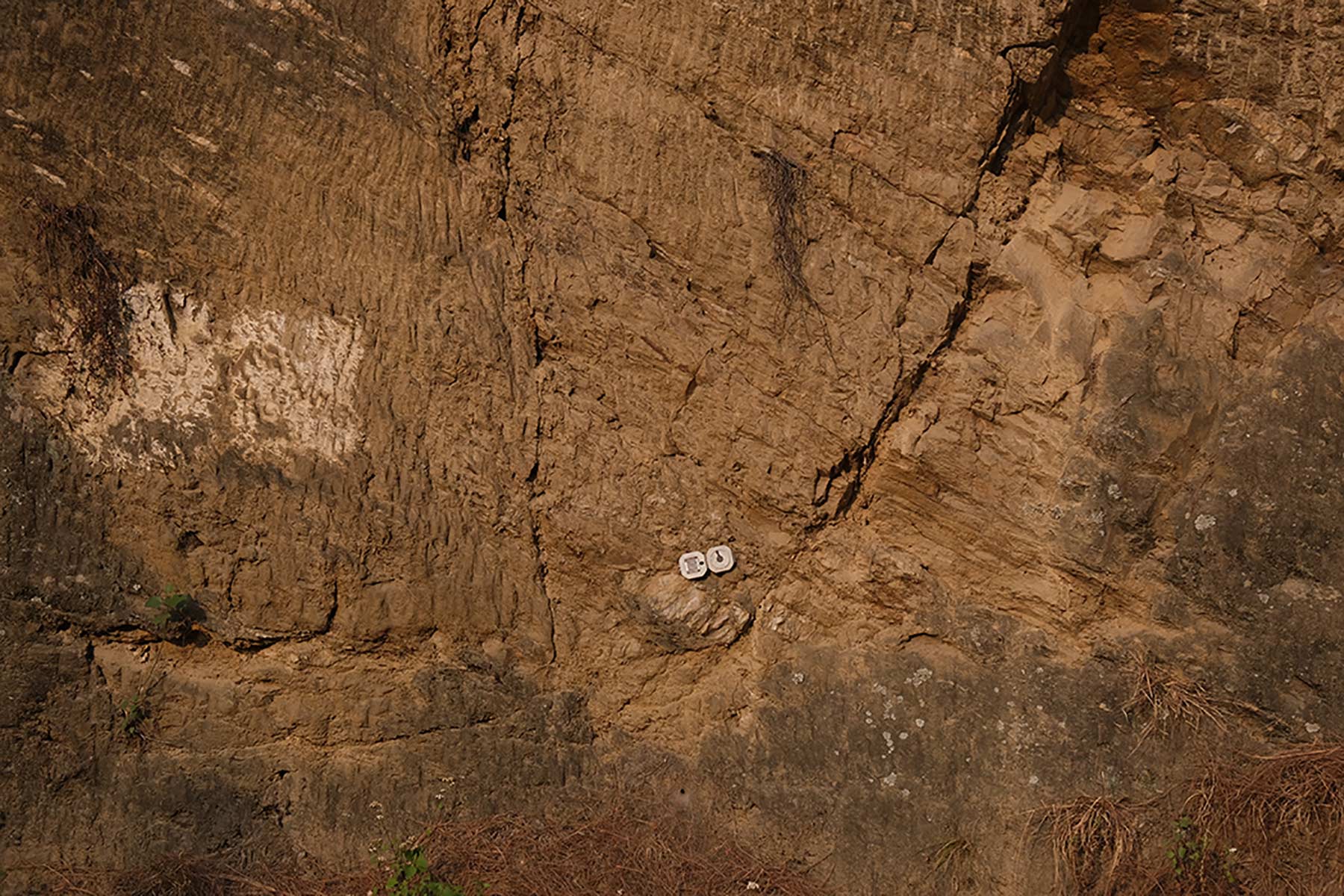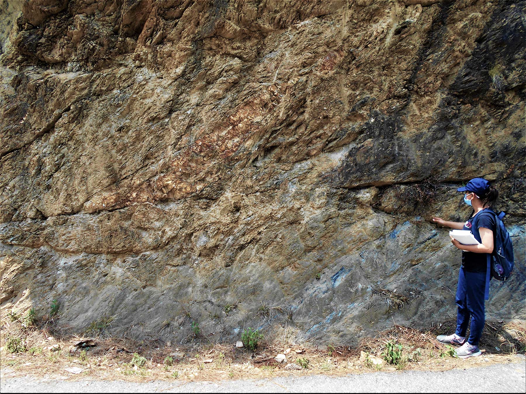 A 20-meter-long exposure of low angle reverse fault (The hanging wall moves up relative to the footwall) in the moderately dipping (30-60°) mica schist. Since the lower portion of the faulted quartz vein in the footwall is not visible, the fault crosscut a big iron-leached, fractured quartz vein, indicating a substantial movement along the fault plane.