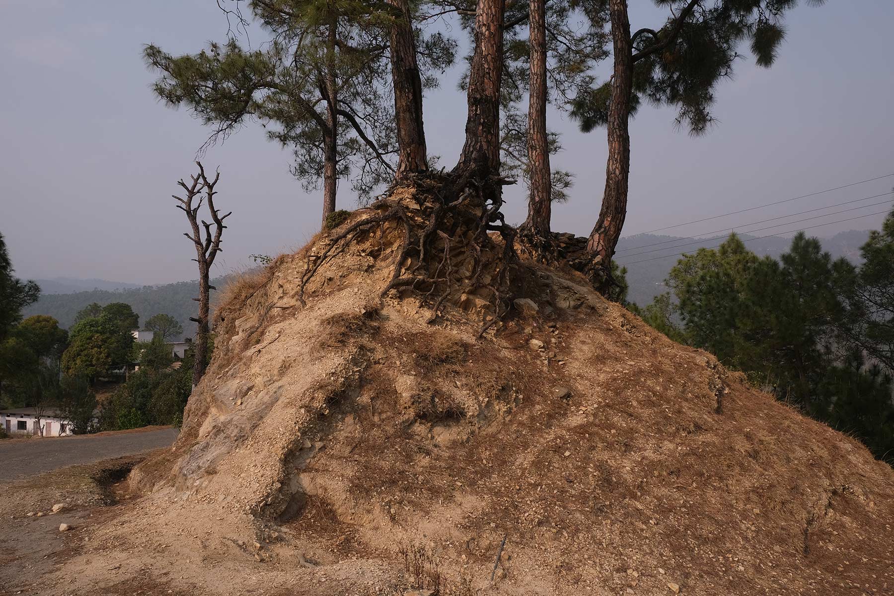 The exposed area exhibits the effects of mechanical (mechanical weathering) and biochemical weathering caused by pine, moss, lichen, and grass roots, which weaken rocks into smaller rocks that are further eroded in place or transported and deposited at other locations and help form soil by supplying mineral particles like sand, silt, and clay, ultimately sculpting the landscapes.